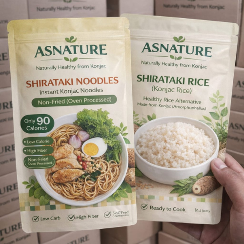 ASNATURE Shirataki Rice is a healthy rice alternative made from premium porang flour. Naturally low in calories and carbohydrates, it is ideal for consumers seeking weight management, diabetic-friendly, or clean-label food options.